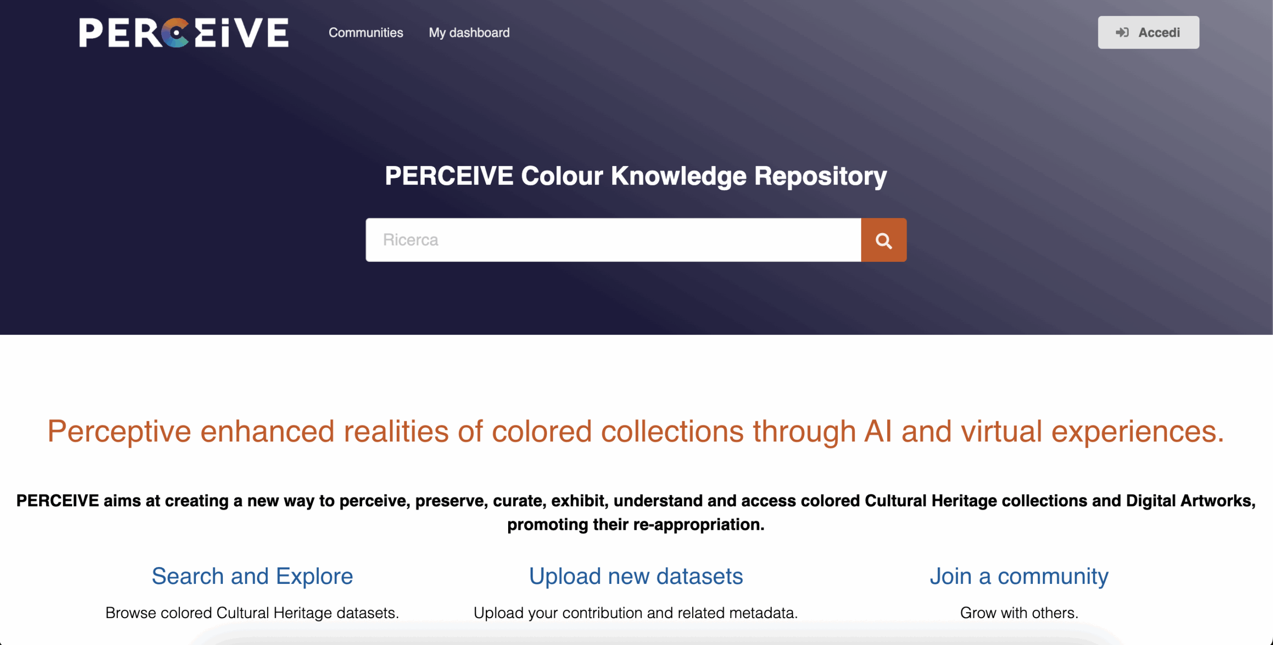 • Communities and Collaboration: Users can create and manage communities within the repository, allowing for collaboration and sharing of data among groups. Currently communities have been created to share data and knowledge about colour in PERCEIVE scenarios (colour loss in originally polychrome ancient sculptures, colour changes in paintings and light-sensitive-coloured objects, colour fading of dyed historical garments and textiles and colour in historical photography and films).